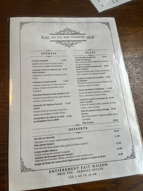 Dear Fabiano, Thank you for your kind words! We’re delighted to hear that you enjoyed the atmosphere, our service, and especially the confit de canard. It’s always a pleasure to know that our guests leave satisfied and happy. We hope to have the pleasure of welcoming you again soon for another delightful experience at Au Fil des Saisons. Best regards, The team at Au Fil des Saisons