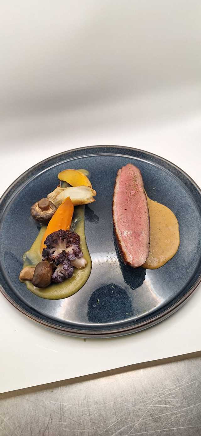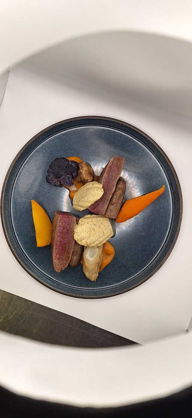 - Sur marbré de poireaux et betteraves rouges, crumble de choux fleur