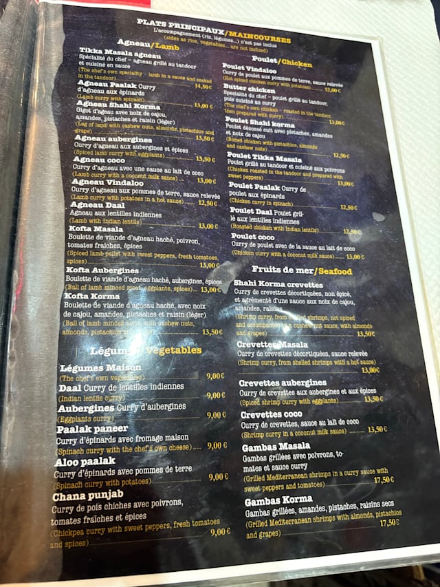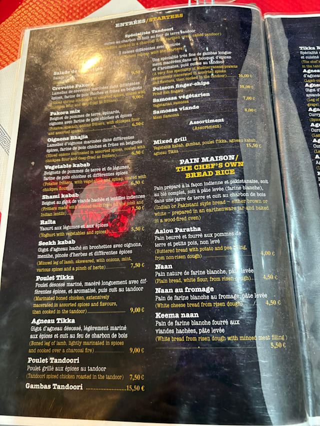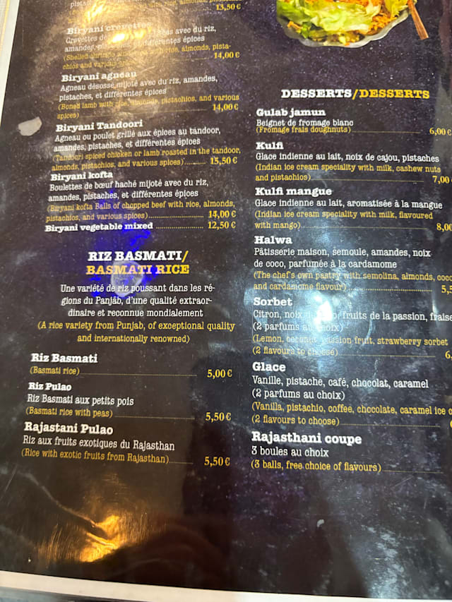 9.5/10Really delicious meal. We chose the main menu which had a good selection of starters and main course. Being too full to attempt the Indian desserts we finished with ice cream. The owner was friendly and the restaurant was very clean and decorated in a lively Pakistani style.. Will visit again when we pass through Rouen.