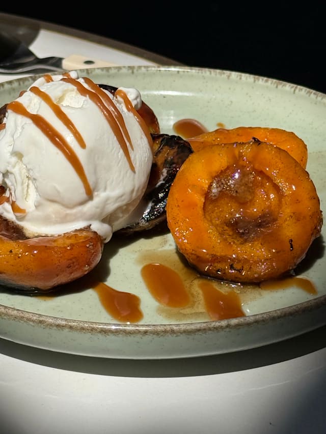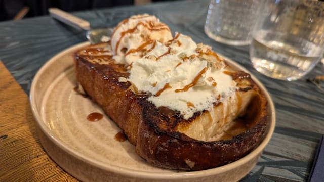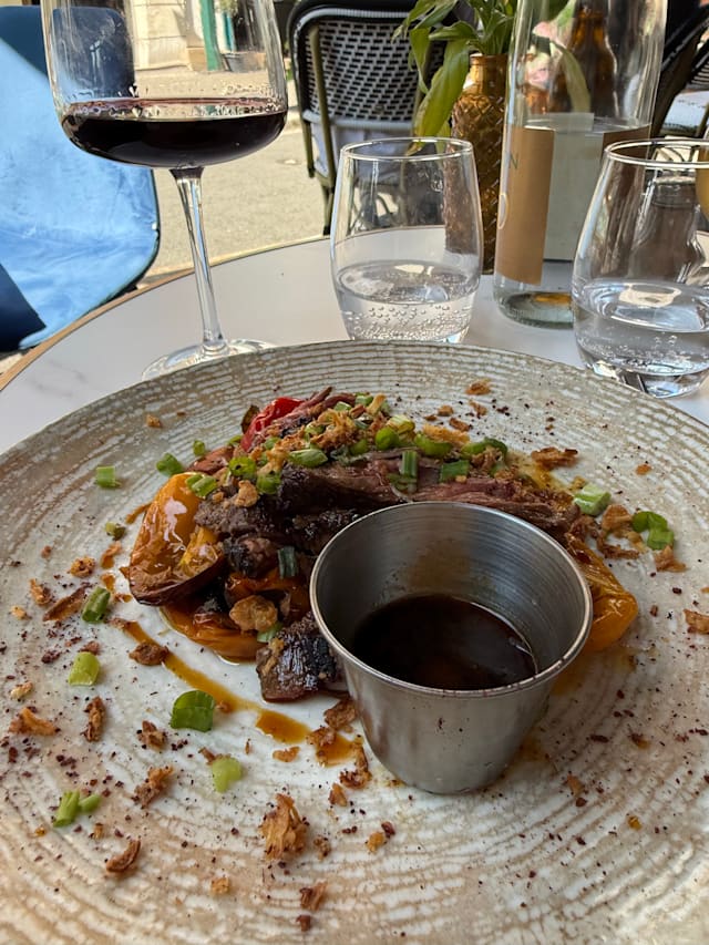 7.5/10First time here, outdoor seating on a pedestrian street was great. Service was prompt, friendly and professional. The plats (2 of us got shrimp, 1 got asparagus) were beautifully presented and tasted great. The entrees (2 of us got lamb, 1 got steak) were okay, not great. For dessert we shared roasted apricot with yogurt ice cream - very simple, very nice. Overall, an okay choice for lunch.