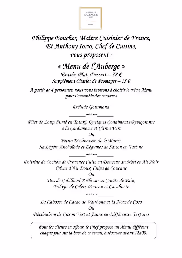 L’Auberge de Cassagne has been a great discovery. The cuisine was excellent, elegant and elaborated. The ambience on the terrace was very pleasant with a remarkable service and kind personnel. Thank you for the lovely time!