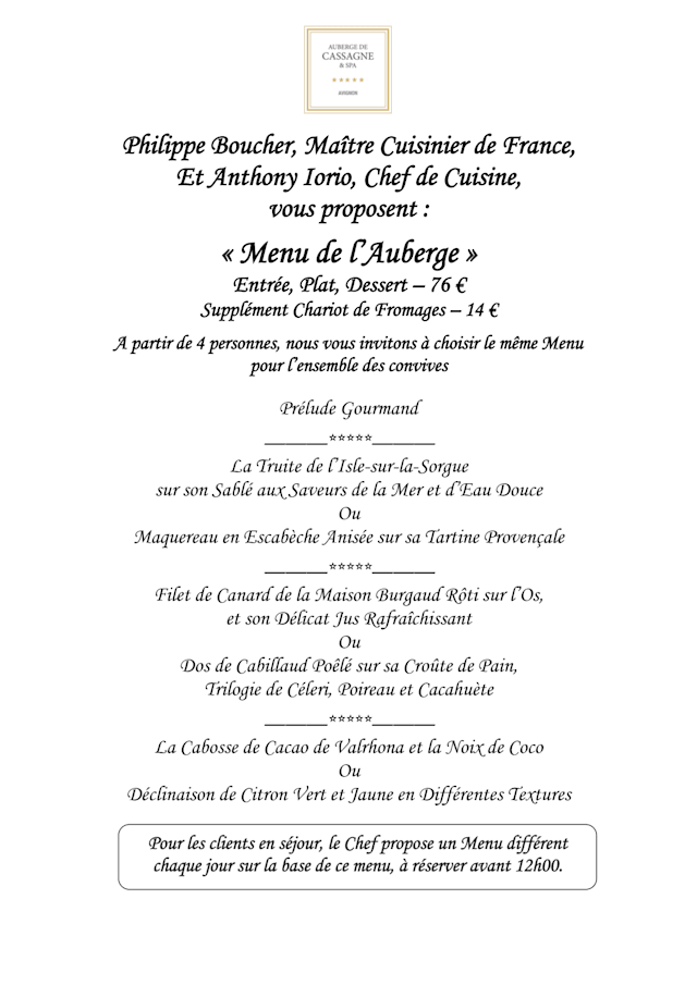 10/10I had a wonderful dinner at Auberge de Cassagne. I had a 3 course meal and the dessert was out of this world. Additionally, the staff is incredible. I also had truly wonderful wine with my meal. Already planning my next visit.