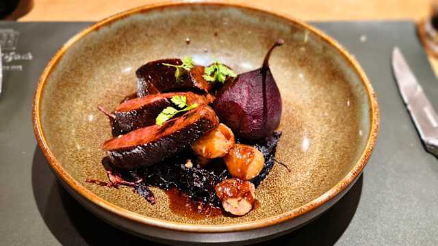 - Réduction jus de veau à la crème de cassis, lard paysan