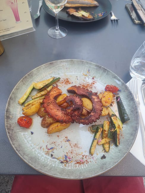 9.5/10Lovely plat du jour on the terrasse at the back of the restaurant. Have been here several times as great VFM! Unfortunately today the poor waiter was on his own serving a very busy lunch crowd so service was not as quick as usual.