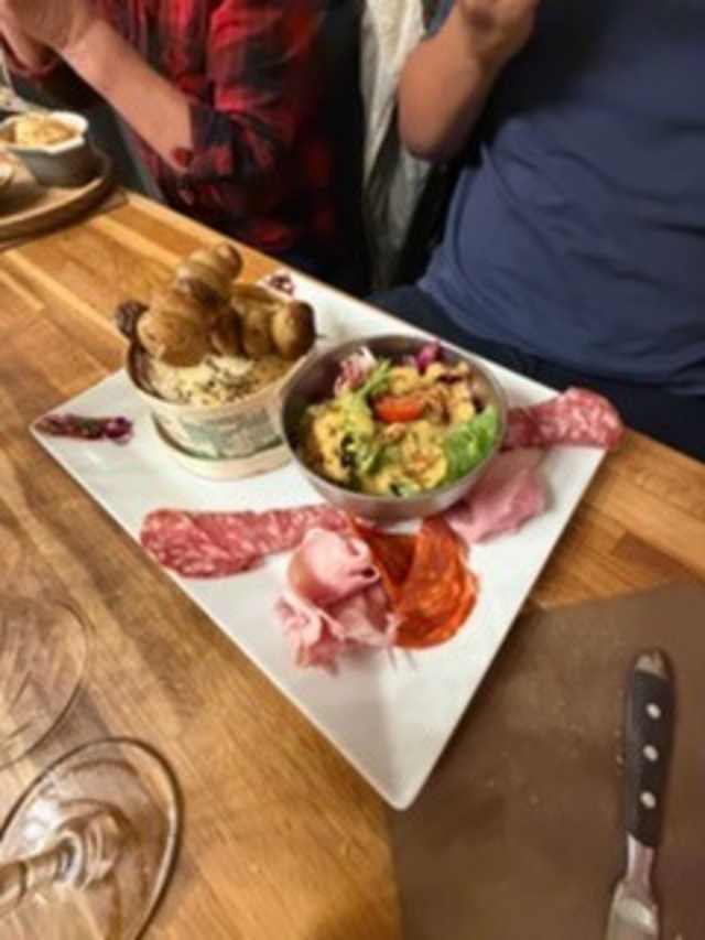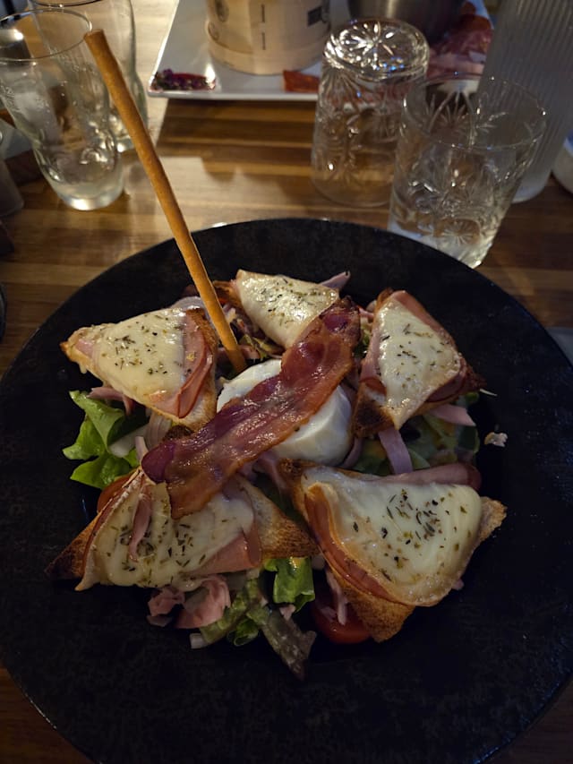 - Salade, magret de canard gravlax, œuf poché oignons, tomate, haricot vert, croutons, noix