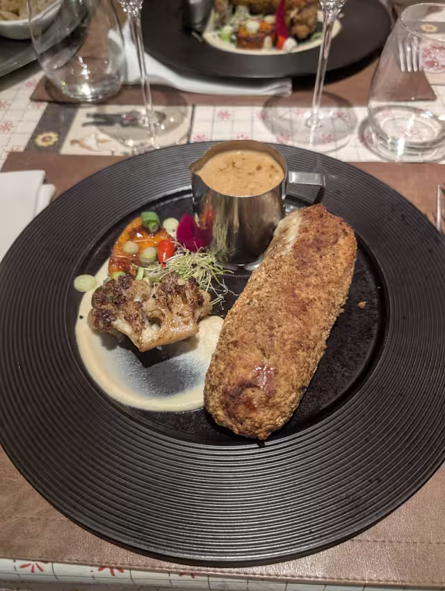 - Cordon bleu de volaille et tome alsaciennes, lard paysan, pané à la chapelure de bretzels, et sauce aux champignons frais