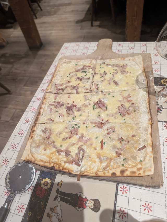 - Lardons fumés, oignons émincés, emmental râpé (nos tartes flambées sont servies midi & soir, mais seulement en apéritif les samedis et dimanches midi.)