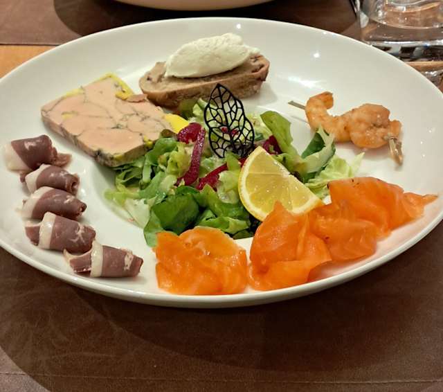 - Foie gras, truite saumonée d’alsace gravlax, magret de canard fumé, toast de chèvre d’alsace, brochette de crevettes marinées, salade composée