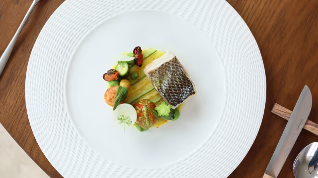 - L’aïoli - plat signature, baudroie moelleuse, ail léger et mosaïque de légumes, l’aïoli à l’ancienne au mortier, en salle