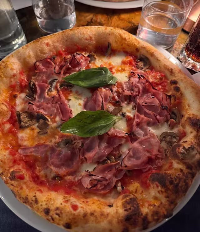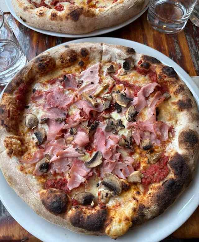 - Sauce tomate, fior di latte, jambon gran biscotto, champignons, huile d’olive extra vierge, basilic