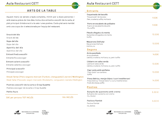 Menu arts de la table €50 per guest