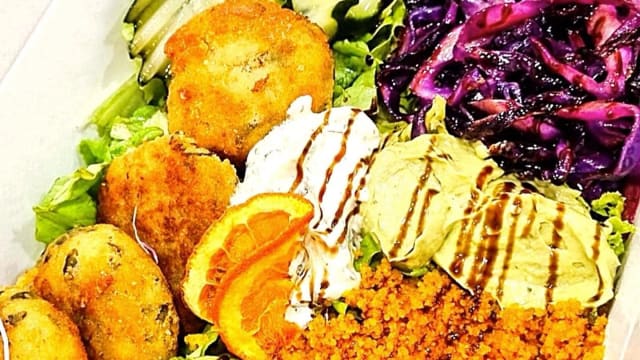 Couve roxa e rúcula, couscous de limão, milho, pico de galo, almôndegas de feijão preto, creme de abacate e sour cream.