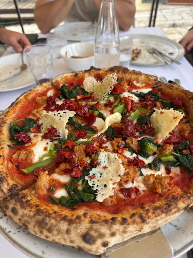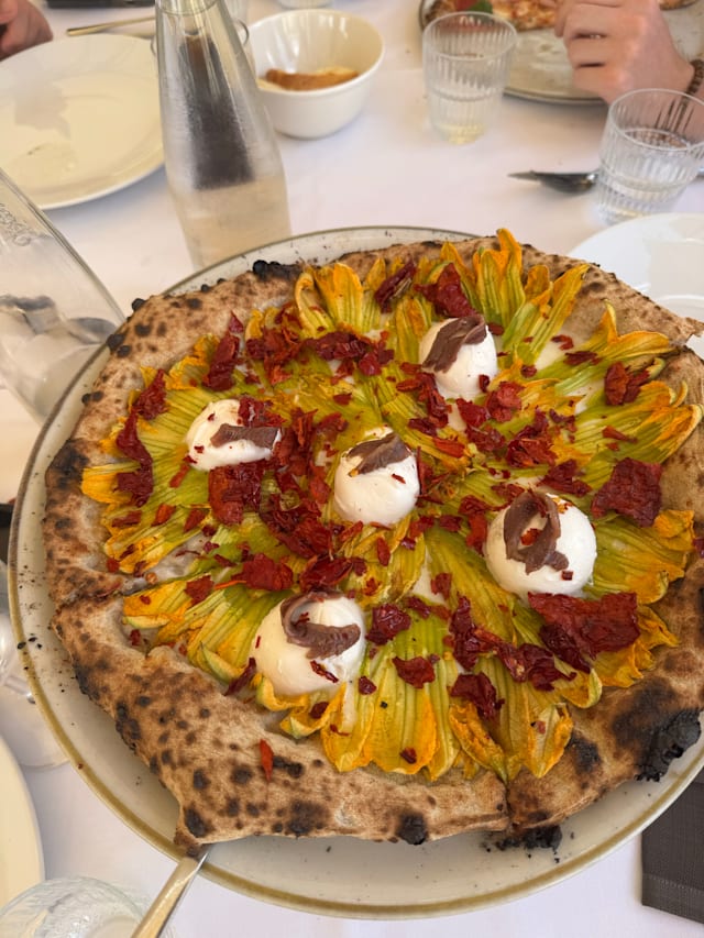 5.5/10Friends of ours ate here last year and highly recommended the restaurant. We were looking forward to a great dinner. We ordered pizza and a first course. We had eaten a very large lunch earlier. The waiter returned to our table and said that “his boss wouldn’t let us order one pizza for two people” but strangely, we could order one pizza and and the fried peppers so that’s what we did. The peppers were greasy, unlike the ones we had eaten at lunchtime. The interior of the pizza crust was very wet-I think the liquid from the burrata had leaked. We ate a little of the crust and scraped off the cheese, bacon and greens and finished those parts, leaving the dough on our plates. The restaurant wasn’t busy—there were people at only five of six tables. When the waiter asked how our pizza was,, we told him. He said he was sorry. It was a very disappointing dinner. The room, however, is very nice but that doesn’t excuse the food.