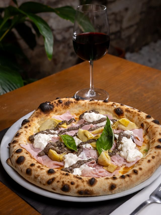 - Mozzarella,jamón cocido, stracciatella, crema de trufa, alcachofas