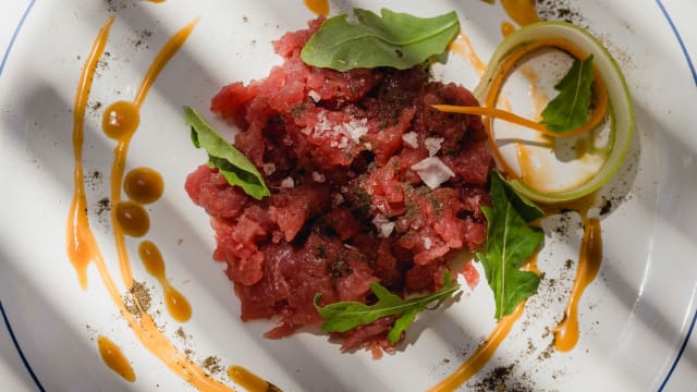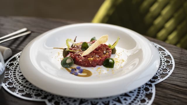 Tartare di manzo con giardiniera homemade, mayonese al sesamo e carta musica