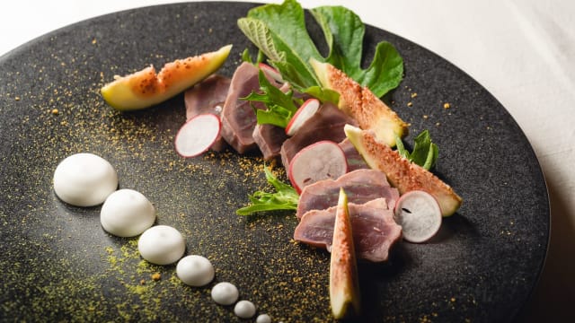 Saltimbocca pugliese di pescatrice con capocollo croccante, agretti, salsa al beurre blanc e olio alla salvia