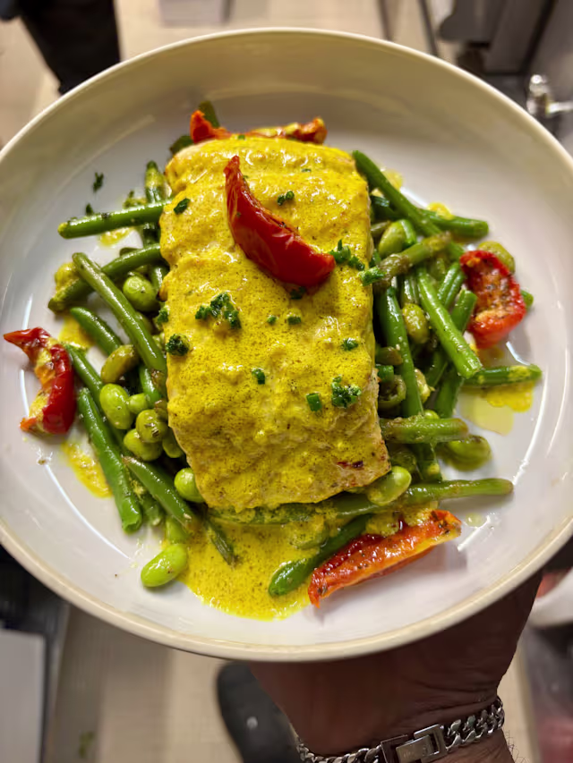 - (Selon arrivage) poisson frais du marché, cuisiné avec soin par le chef, accompagné de sa garniture maison