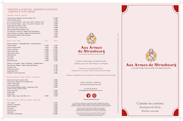 "Aux Armes" in Strasbourg, restaurant of Alsatian specialties (home cooking) thanks you very much for your visit, sensitive to the comments addressed to us, and which we take into account, we take your feelings into consideration and are happy that you appreciated the the warm atmosphere of the place, the quality of our service and keep excellent memories of our brand. Jessica and the boys wish you a pleasant stay in Alsace.😀