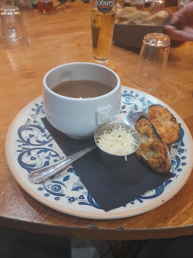 Bonjour, quelle surprise!!! Pourquoi navoir rien dit sur place, nous aurions pu comprendre ou etait le problème ! Notre soupe à l'oignon fait pourtant un carton, et nos habitués la reprennent souvent. Oui un petit pot de gruyère est servi à côté...ou est le problème? Pour les plats , je ne comprends vraiment pas comment vous avez pu être déçus!!! Nos desserts sont simples, effectivement, comme le reste , mais avec du goût! Nous ne sommes pas un gastronomique, mais une bonne brasserie !! Simplicité, gourmandise c'est mieux que complication et pas bon!! Encore désolée que vous ayez été déçus et surtout que vous n'ayez pas su nous en faire part! Salutations gourmandes
