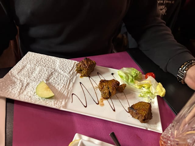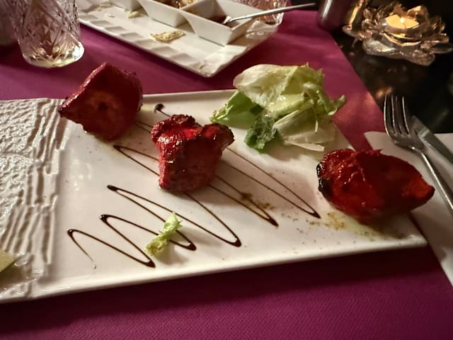 9.5/10Having made a very last minute reservation for one, I arrived at the restaurant at 19:00 on Friday 28 July and was shown a table at the rear, from where you could see the chef at work. I was the first to arrive, but after some 30 minutes the restaurant, which is small and cosy, was already more than half full and when I had finished my main course, every table was taken.. The food was delicious. As a starter I had pieces of salmon fillet with spinach and spiced cream, nicely presented, and a coconut naan, both very tasty. My main was a vegetarian dish with aubergine, which, although it did not look as attractive as the starter, was also very good. It was served with basmati rice. For dessert I chose the "thé gourmand", consisting of a cup of any tea from the menu, accompanied by four mini-desserts (for those who find it hard to choose). I cannot speak for any of the drinks on the menu: as it was a hot day, I ordered a large bottle of sparkling water to go with the food. I was very happy with my choice of restaurant and will certainly book a table at this place again, next time I visit Lille. One more thing: when I left, people were (still) waiting outside the restaurant to get a table. Always a good sign.
