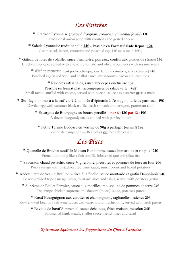 10/10Very good food, typical Lyones, a place that surely we will visit again when we will back here! We appreciated the pumpkin soup, the traditional sausages made with pistachio or that one made with cow stomach (tripe sausages), and the lamb, the Charolais meat was really wonderful. Finally the sirup pear and the traditional dumpling was the "cherry on top"! We drink 2 local red one dry and fresh and the other floral and aromatic. Thank you to one of the best "Bouchon Lyonnaise"!