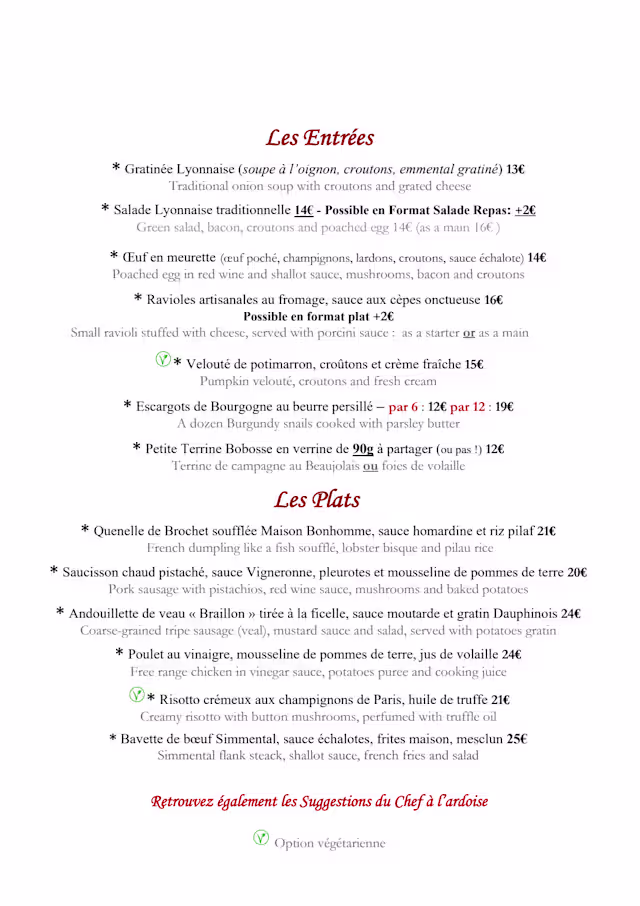 Delicious traditional Lyonais dishes in a warm and inviting atmosphere with exceptional service in a very cute part of town. Highly recommend to anyone visiting Lyon!