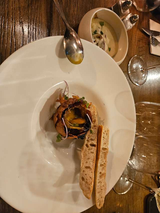 - Oignons rôtis, jaune d’oeuf crémeux, siphon à la truffe et pain grillé