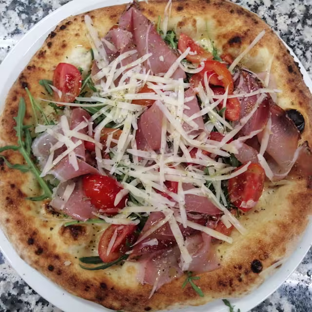 - Mozzarella cheese, olio, origan, pomodoro fresco, ham, arugula, scaglie di grana
