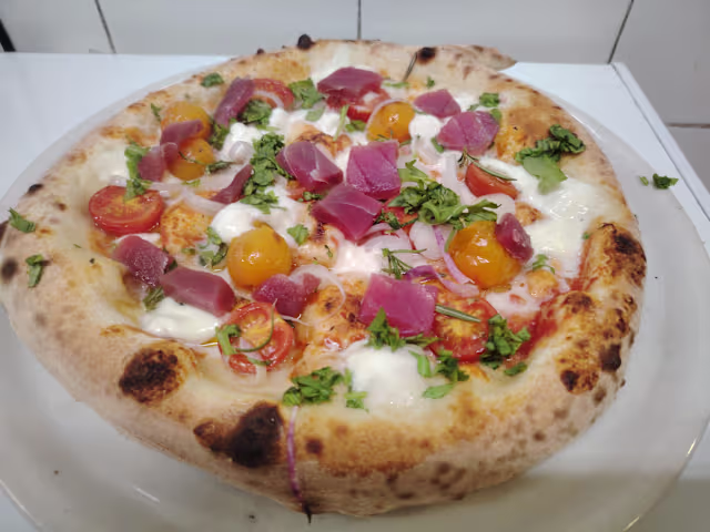 - Onion, crema di pistacchio, funghi, granella di pistacchio, mozzarella cheese, boiled ham, ricotta fresca