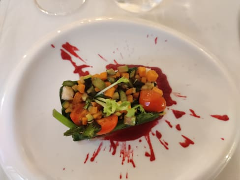 8.5/10We were very excited to eat something more experimental in a cosy setting and were happy we got a table. Ordered the 'Area creativa' menu in vegetarian for the three of us. The creme brulee starter was absolutely incredible, the prosecco and wine were great as well, and so was the starter and primi piatti. All wonderful and beautifully made plates too. The main course however was very bland and consisted of just a plate full of steamed vegetables with some (good!) olive oil. No other addition or flavor. I believe this might have just been bad luck for us, because the rest of the dishes were great and the other available veggie dishes on the menu looked very promising as well. Desert was great too. We would come back next time, but would choose the specific dishes. Service was great!