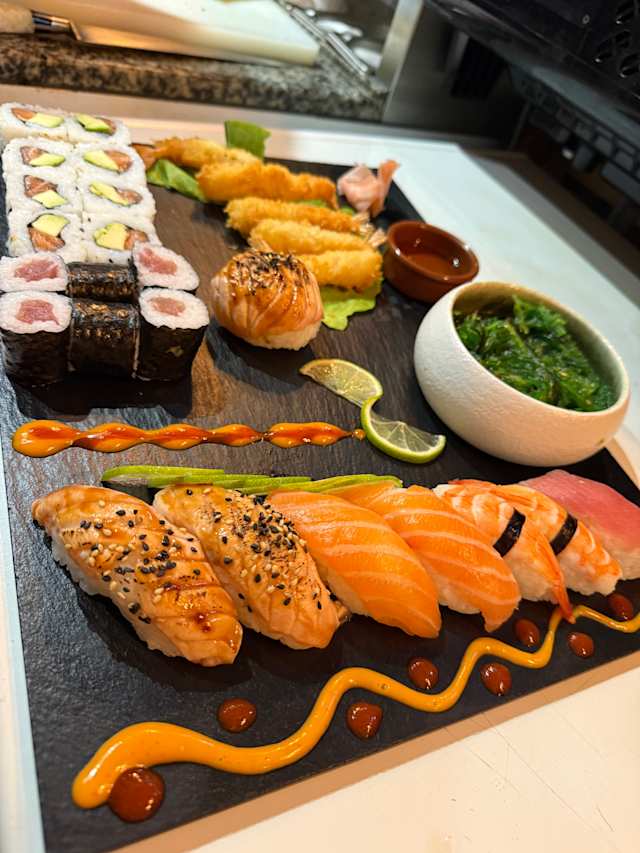 - 4 p nems poulet 8 p california saumon avocat 6 p maki concombre fromage 2 p sushi saumon 2 p mochi coco et mangue