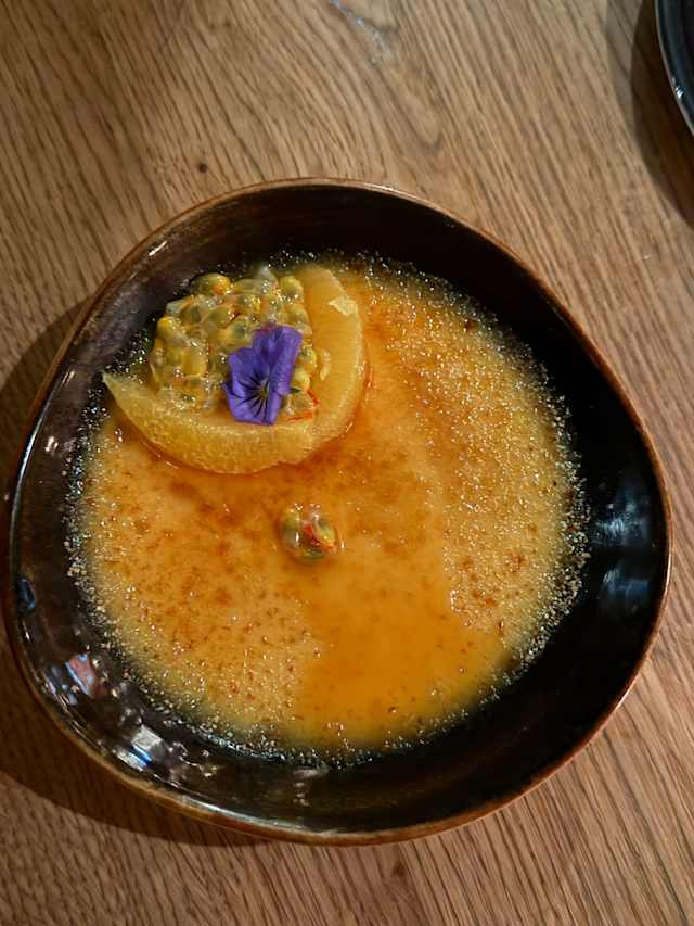 - Tiger milk, ingelegde sjalotten, kumquat, krokante maïs, avocado crème