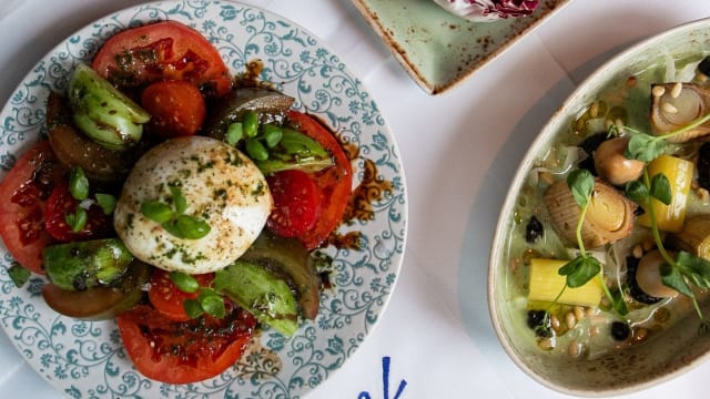 Tzatziki, tomaat, little gem, manchego, ingelegde sjalotten