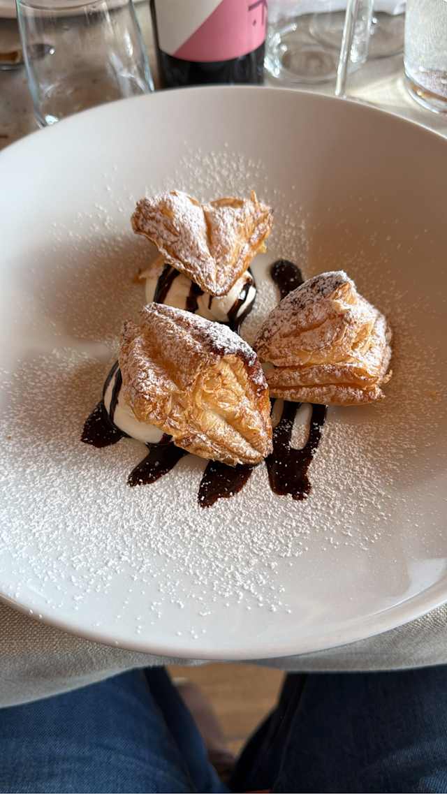 - Linguine aglio, olio al limone, peperoncino in conserva su crema di baccalà, pane croccante alla colatura di alici e crumble di olive nere