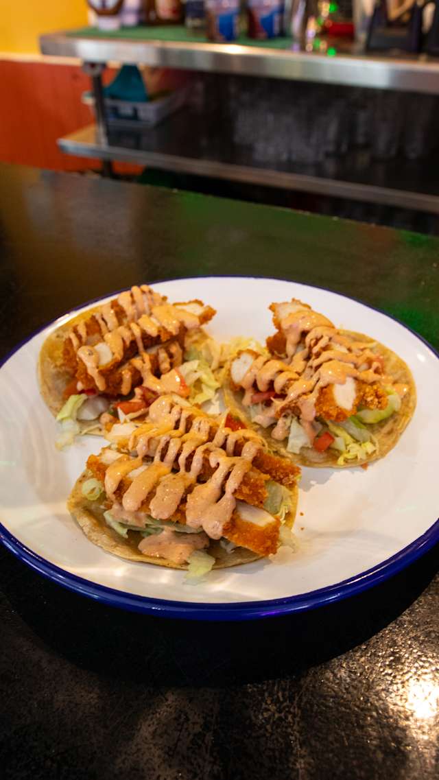- Pollo empanado y crujiente, en 3 tortillas de maiz con pico de gallo y lechuga, cubiertas por salsa de mayonesa chipotle.