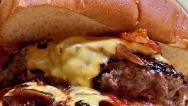 Panino ANNI ‘80: scottona 220gr insalata, funghi, scamorza affumicata, mortadella, crema di pistacchio. Patate dippers a lato