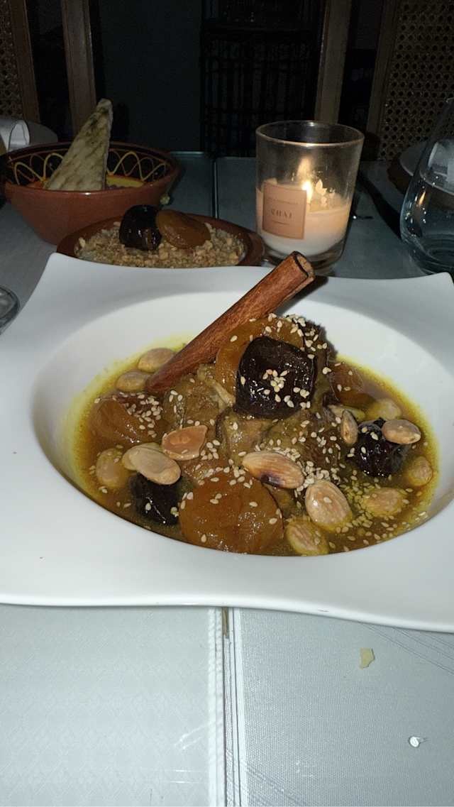 - Cordero lechal, ciruela, albaricoque seco, almendras acompañado de semola