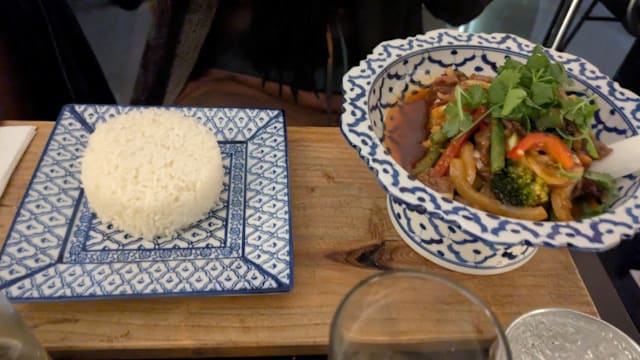 10/10I chose this little gem because it was rated highly on the fork and I was craving some Thai food. It was the only Thai restaurant nearby where I was able to make a reservation a few hours before dinner. The rooms were dimly lit creating a cozy and romantic atmosphere. The gentleman who greeted us was friendly and enthusiastic. He explained the dishes with great pride and excitement. His energy was contagious. We ordered two glasses of champagne. The glasses were so tiny but the champagne was great so I forgave him. I ordered the papaya salad and the shrimp pad Thai Both were delicious. I didn't taste the papaya, but papaya has no flavor anyway so I wasn't disappointed. My partner ordered the special, carpaccio de salmon and saute de beuf Thai. His dish was even better than mine. The sauce was phenomenal with a touch of heat. The vegetables in both dishes were fresh and plentiful. For dessert I had the flan, which was not the flan I was expecting. I am used to the Mexican flan. This flan was more cake like. It was not too sweet and had a unique look and flavor, which I liked. My partner got the banana nem which was very good. Both deserts were presented beautifully with a physalis fruit on top. We enjoyed our evening so much we would like to return again in the future.