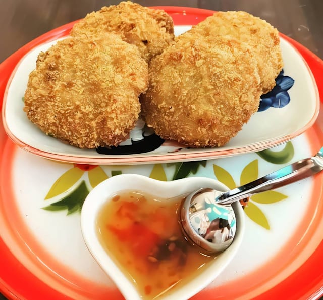 - Bolas fritas de cerdo marinado en salsa picante, hierbas y arroz tostado molido.