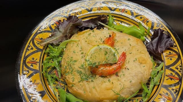 - Gehaktballetjes in tomatensaus, kippenvleugels uit de oven, garnalen pil pil, 2 kip briwat, lehdes, geserveerd met Marokkaans brood