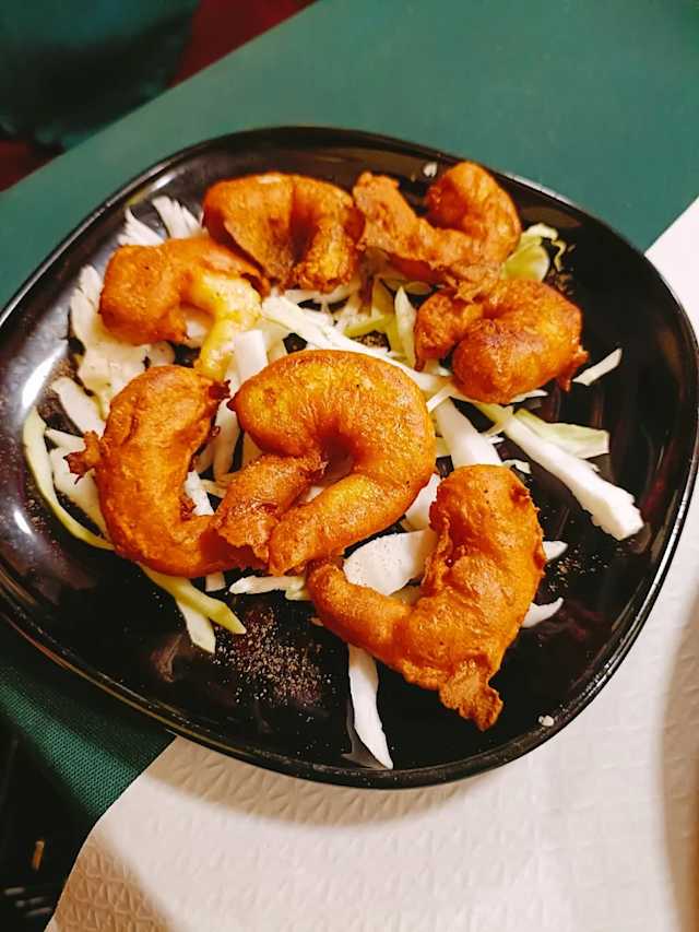 - Gamberi teneri marinati con spezie, immersi in pastella e fritti fino a doratura.