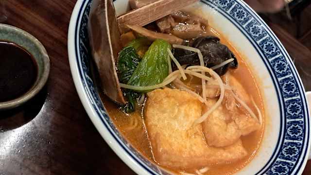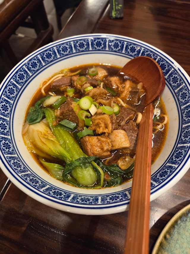 - Spaghetti fatti a mano con brodo di manzo da 7 ore con spezzatino di manzo germogli di soia coriandoli e rapa bianca.