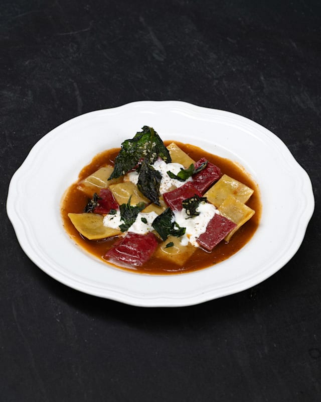 - Crosta di pomodori secchi, capperi e olive taggiasche su crema di zucca, salsa yogurt alla menta, corallo croccante decorativo