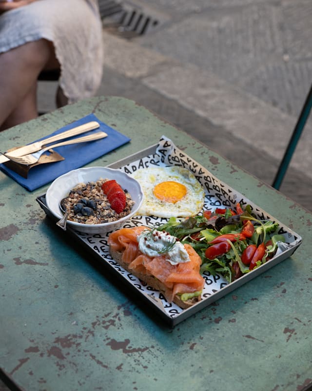 - Avocado e uovo al forno, salmone marinatoº, salsa tzatziki, pepe rosa e pane tostato