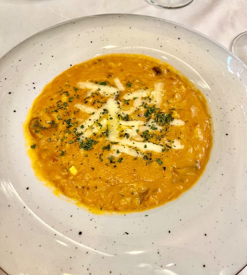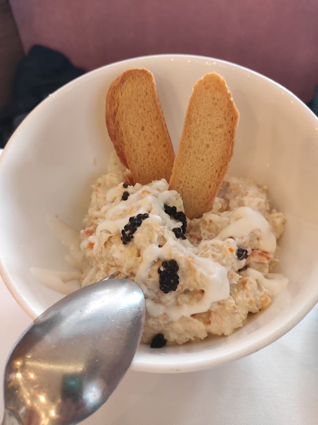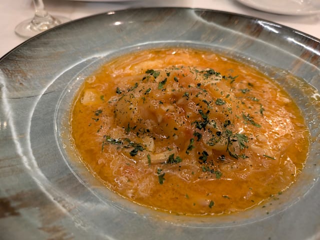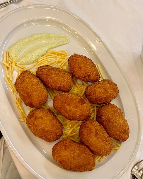 10/10Superb food, cod offered in a wide variety of preparations plus many options besides seafood. The dining room was elegant and gracious, with heavy linens and changes of silverware with each course. The only uncomfortable note was the waiter’s apparent confusion, first not recognizing the reservation (we showed him the email from the Fork), then not understanding that we wanted food, not just drinks. We realized that we were early by Spanish standards, but the time slot was offered. In any case, we had an excellent dinner of foie gras to start, followed by croquettas of cod and an amazingly complex risotto with cod, tomato, mushrooms, and truffles.