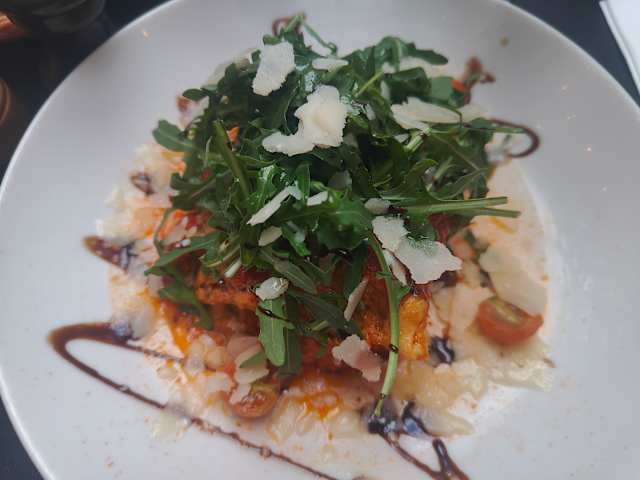 - Conchiglie, truffe, crème de champignons truffée, aubergines rôties, champignons poêlés, tuile de parmigiano reggiano, roquette