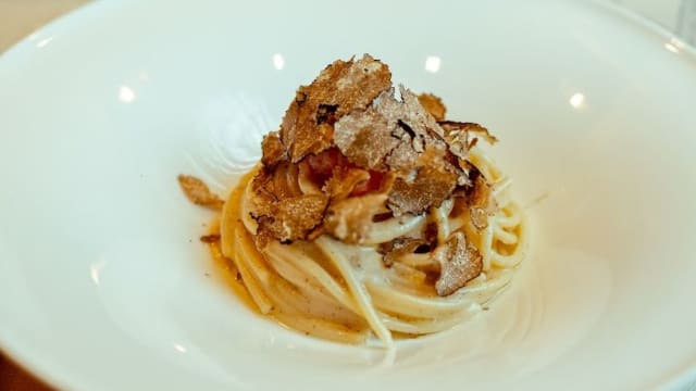 Spaghetti alla chitarra Pastificio Mancini cacio e pepe con tartare di gamberi e tartufo nero estivo