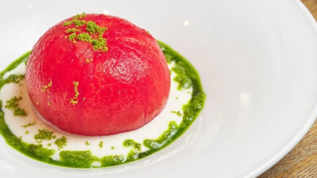 Pomodoro rosso ripieno con melanzane, ricotta salata e basilico su fonduta di parmigiano reggiano