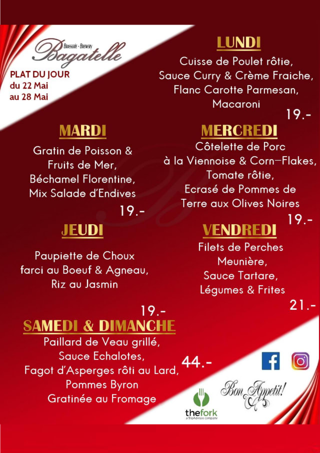 10/10Searched for a classic French style brasserie in Geneva, and found Bagatelle. Excellent menu, food well executed. The entrecote Parisian seemed popular with customers, as well as onion soup, salads and deserts. Attentive service. Mid week Bagatelle 2/3 full. Good atmosphere with old fashioned red banquets. Not as fancy as Brasserie Lipp, but less expensive too. Bob Clark