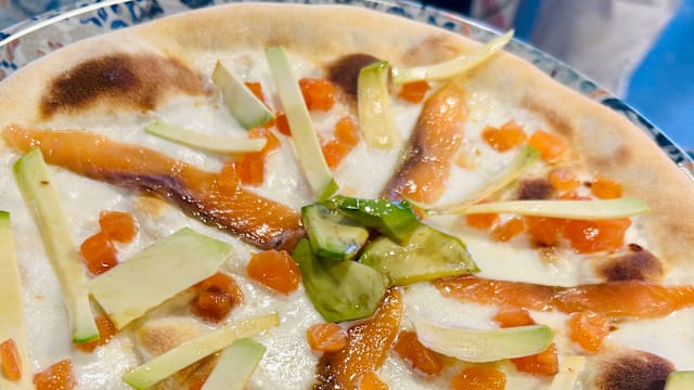 Pomodoro san marzano D.O.P., mozzarella fiordilatte, carciofi, funghi champignon in uscita: prosciutto cotto alta qualità, olive taggiasche, olio EVO